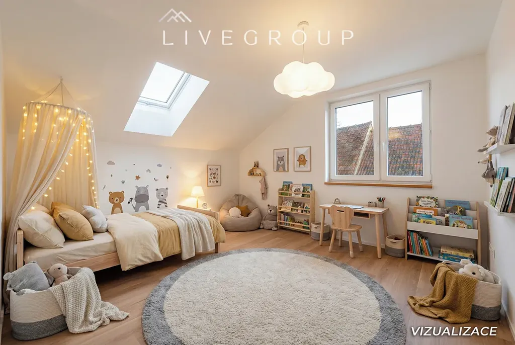 Všechny tři velkorysé ložnice mají dostatek přirozeného světla. Součástí domu jsou také dvě koupelny, dvě toalety, úklidová místnost, technická místnost a prostorné parkovací stání pro dva až tři vozy za elektrickou bránou.