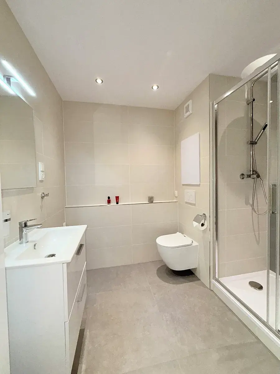 • Prostorná koupelna s velkým sprchovým koutem, WC a skřínky