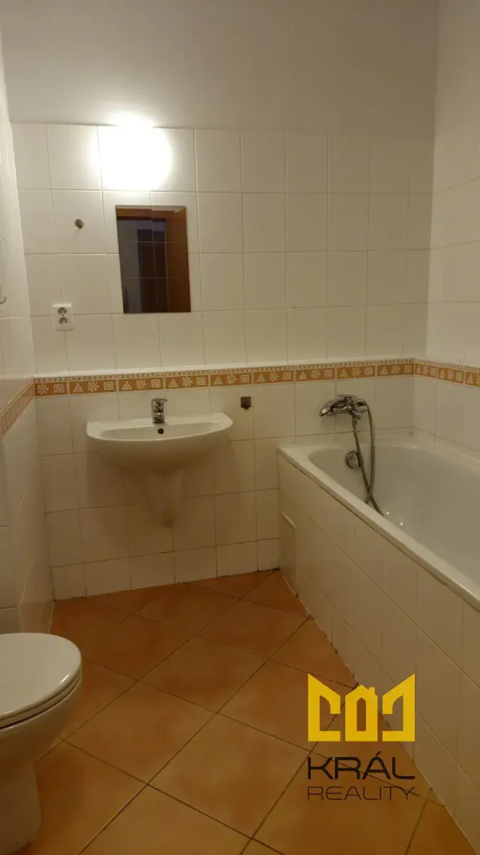 Koupelna s vanou, toaletou, žebřinovým topením a automatickou pračkou.