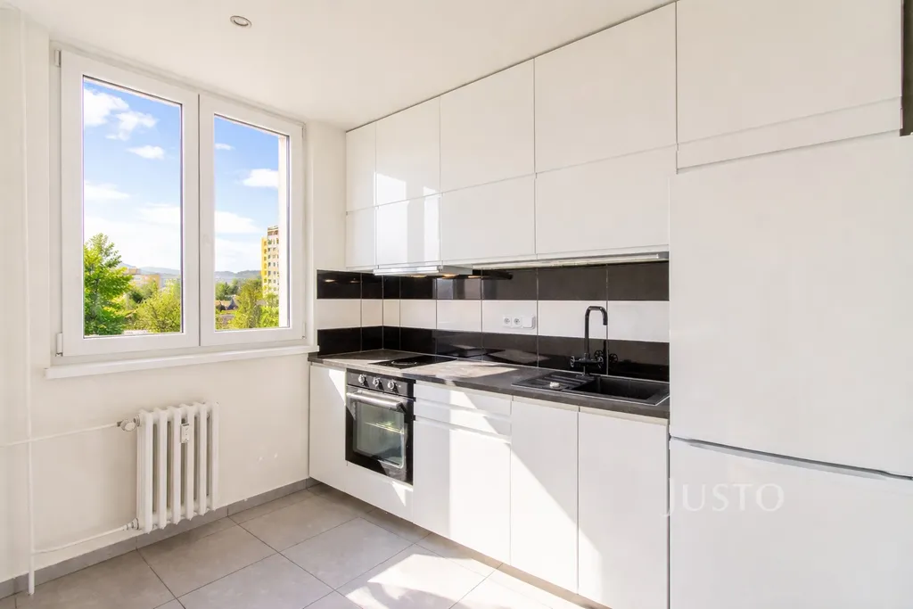Předmětem prodeje je bytová jednotka o dispozici 2+1 nacházející se na ulici Novodvorská ve Frýdku-Místku. Velice světlý byt, který využil svou výměru 44 m² na 100 %, protože se lehce změnila dispozice jeho původních místností. Co je obrovskou výhodou této nabídky je až extrémně nízká platba do fondu oprav (354 Kč), což činí z tohoto bytu naprosto ideální investiční příležitost. Kuchyňská linka v bílém lesku je vybavena vestavnou troubou, volně stojící lednicí s mrazákem a sklokeramickou deskou. Koupelna se oproti původní variantě bytu trochu zvětšila, čímž se do ní prostorově vměstnal sprchový kout, umyvadlo se zrcadlem, topný žebřík, závěsné WC a také prostor pro pračku. Obývací pokoj je čtvercového tvaru a díky třem oknům je nádherně prosvětlený. Punc tomu všemu dodává výhled na Lysou horu, který si zamilujete. Poslední místností v bytě je obdelníková ložnice. V předsíni je místo k vytvoření vestavné skříně pro potřeby úložného prostoru. Byt má nové vstupní dveře, nové žaluzie, je čerstvě vymalovaný a důkladně vyčištěný.