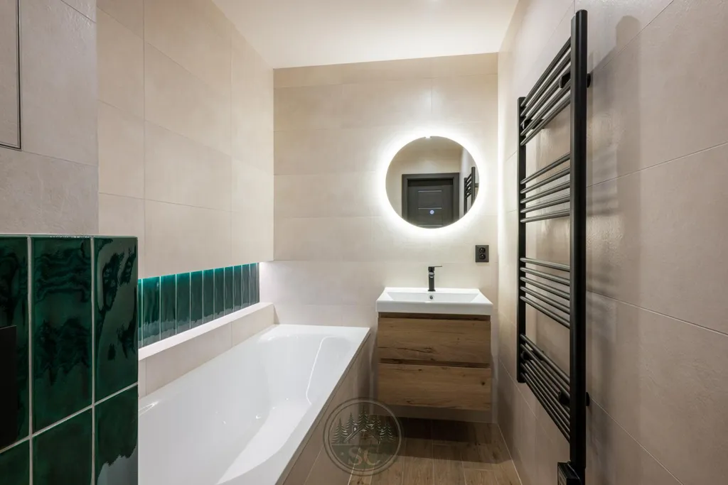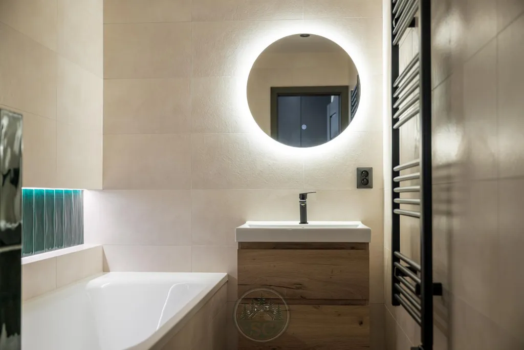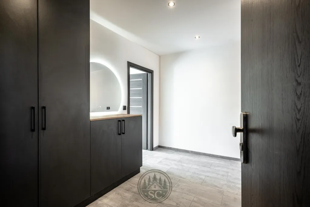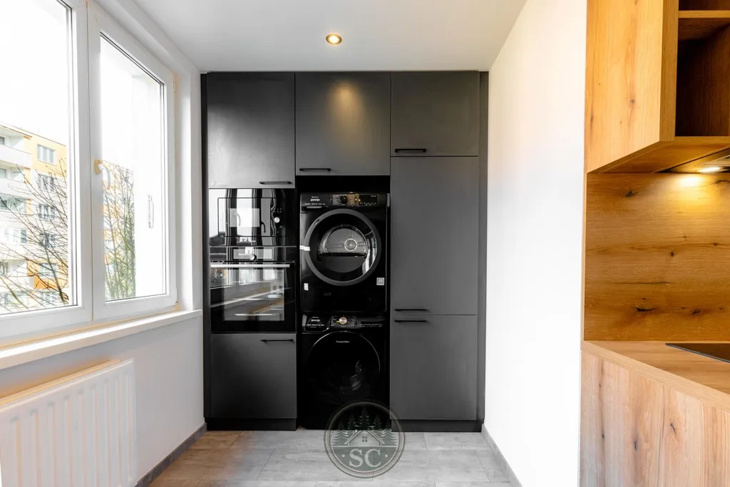 Kuchyňská linka a vestavné skříně na míru od truhláře, masivní jídelní stůl, zabudované spotřebiče, obývací skříňka s přípravou pro TV, nádherná koupelna s podsvícenými nikami samozřejmostí jsou kompletní nové rozvody.
