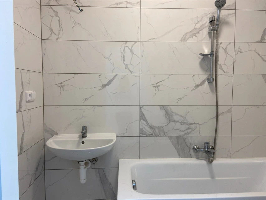 Interiér bytu zahrnuje prostorný obývací pokoj, samostatnou kuchyň se spíži, kuchyň je vybavena spotřebiči (lednice, trouba s varnou deskou myčka), ložnici a koupelnu s vanou a WC. Všechny místnosti jsou světlé a nabízejí dostatek prostoru pro pohodlné bydlení.