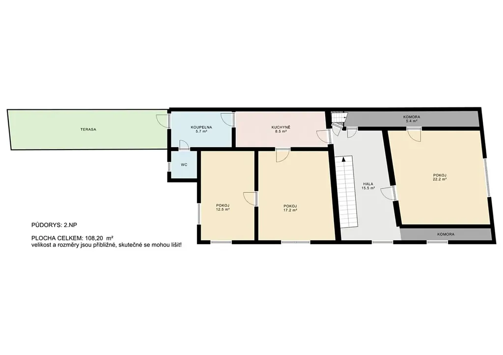2. nadzemní podlaží (108,2 m2): Nabízí tři samostatné pokoje, kuchyni, koupelnu, komory a vstup na venkovní terasu.