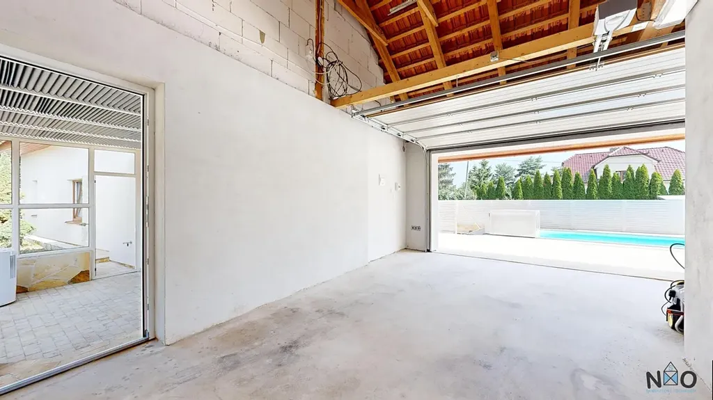Vedlejší stavba, kde se dnes nachází garáž, posilovna a sklad, nabízí možnost přestavby na plnohodnotnou druhou bytovou jednotku ideální pro dvougenerační bydlení nebo pro hosty. Podle připraveného půdorysu zde může vzniknout prostorný obývací pokoj s kuchyní, ložnice, šatna i koupelna s přímým výstupem na terasu k bazénu a do zimní zahrady. Celá tato část tak může fungovat jako zcela samostatný a soukromý byt, přičemž propojení se zimní zahradou zachová příjemné rodinné zázemí.