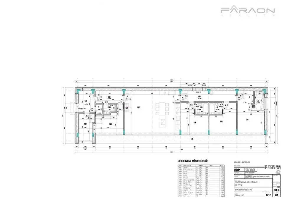 Jednopodlažní praktické uspořádání zahrnuje otevřený koncept (50m2) obývacího pokoje s přípravou na kuchyň, jídelním prostorem a s přímým vstupem na zahradní terasu a následně do zahrady, dále hlavní ložnici se šatnou a en-suite koupelnou, další 2 ložnice s vlastními koupelnami, samostatnou toaletou pro hosty zvlášť, pracovnu, technickou místnost, vstupní hala - předsíň.