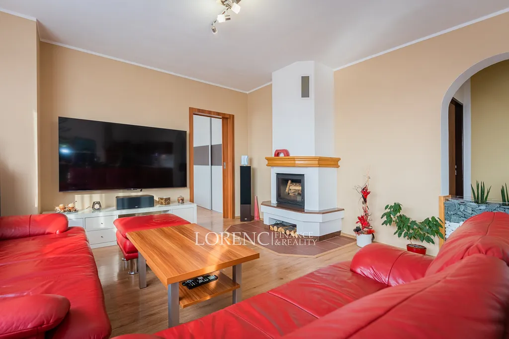 Horní patro (107 m²) je na úrovni místní komunikace a disponuje kompletně zrekonstruovanou bytovou jednotkou 5+kk. Najdete zde prostorný obývací pokoj s kuchyní (40 m²) a krbem, ložnici s vestavěnou skříní (13 m²), pracovnu (9 m²) a dva dětské pokoje (10 m² a 14 m²). K dispozici je samostatná toaleta a koupelna s vanou i sprchovým koutem.