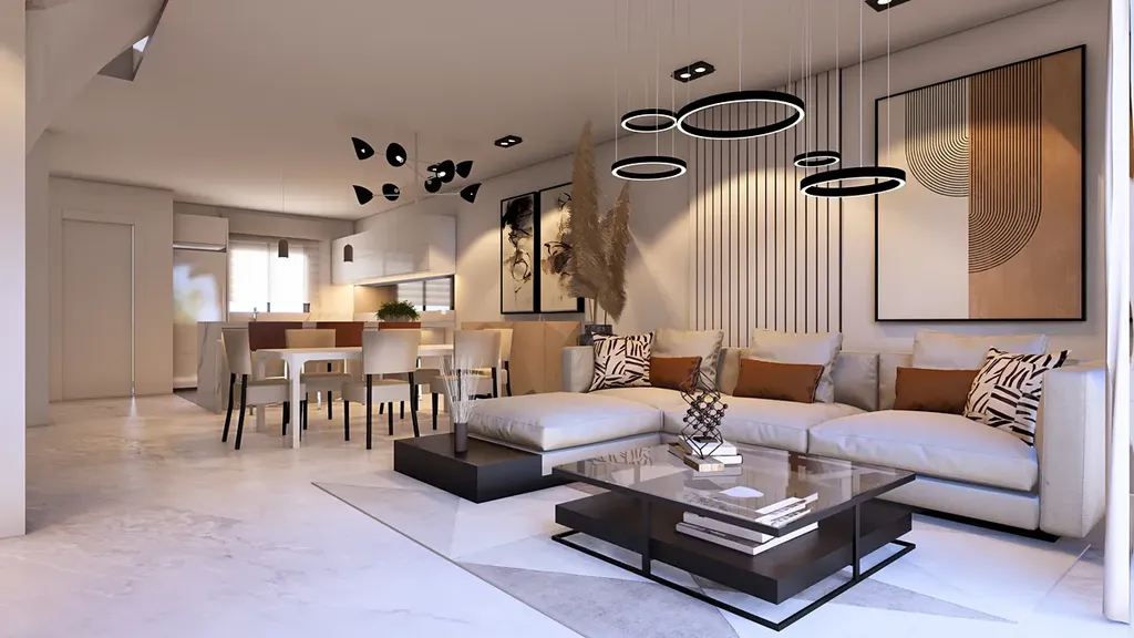 Domy jsou řešeny jako třípodlažní se suterénem a střešním soláriem. V přízemí se nachází prostorný obývací pokoj s kuchyňským koutem a přímým vstupem na terasu a zahradu, které přirozeně propojují interiér s exteriérem. Součástí přízemí je také samostatné WC.