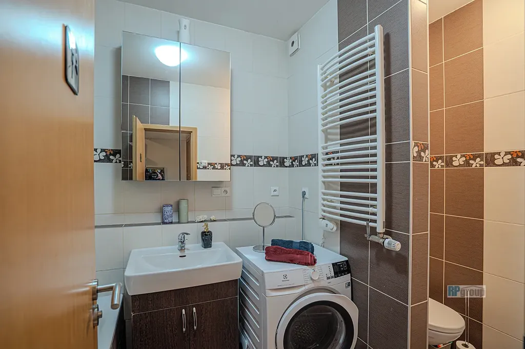 Dispozice bytu je prakticky řešená: z předsíně je samostatný vstup do ložnice, koupelny i obývacího pokoje s kuchyňským koutem. Díky jihozápadní orientaci je byt příjemně prosvětlený po celý den a působí vzdušným a útulným dojmem.
