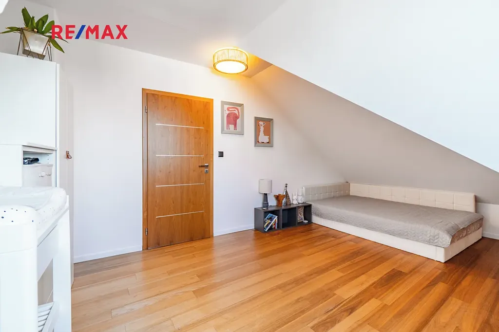 Horní patro nabízí vzdušnou ložnici se střešními okny, která dodává bytu charakter a pocit většího prostoru, než jaký bývá u klasických dispozic.