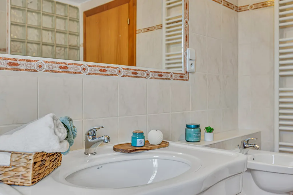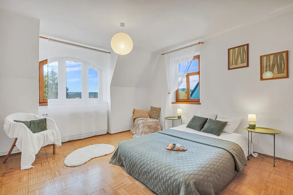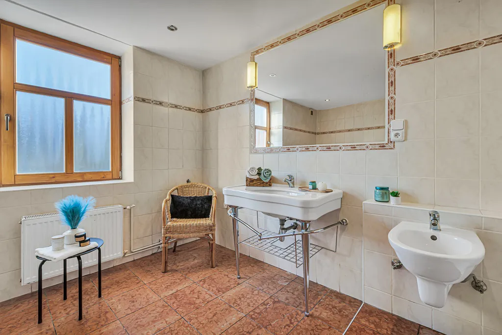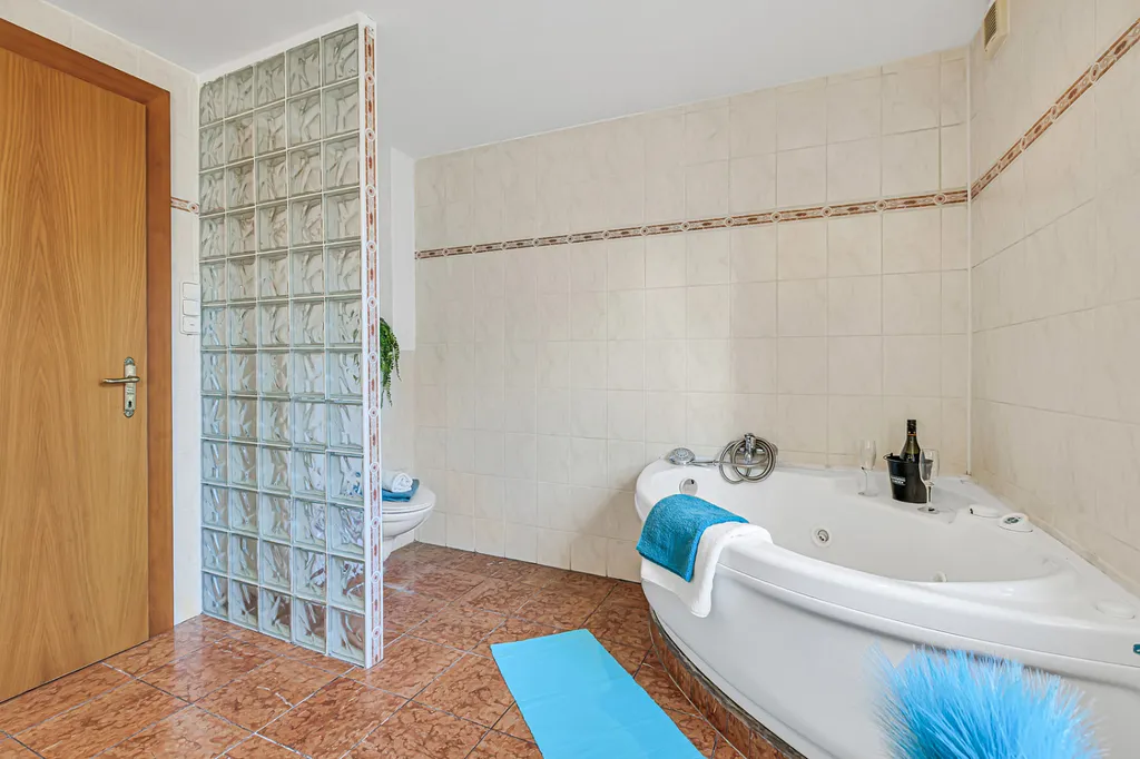 Velkým benefitem je nadstandardně prostorná koupelna s hydromasážní vanou a bidetem, která nabízí komfort, jaký dnes v bytech často nenajdete.