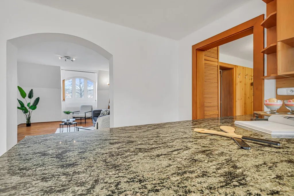 Byt zaujme především svou velkorysou dispozicí, světlem a příjemnou atmosférou. Najdete zde velké místnosti, dřevěné prvky, oblouky mezi místnostmi i přiznané trámy, které dávají prostoru charakter a odlišují ho od běžné nabídky.