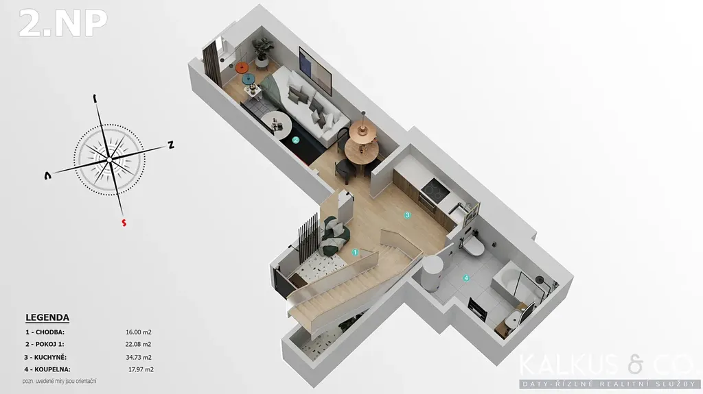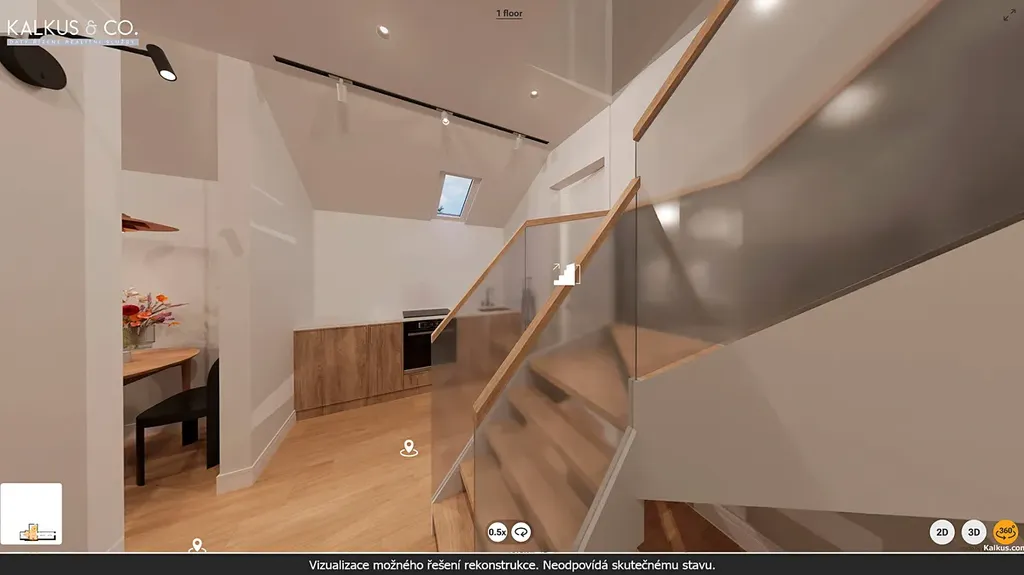 Apartmán je řešen jako dvoupodlažní mezonet s dostatkem prostoru pro větší rodinu.
