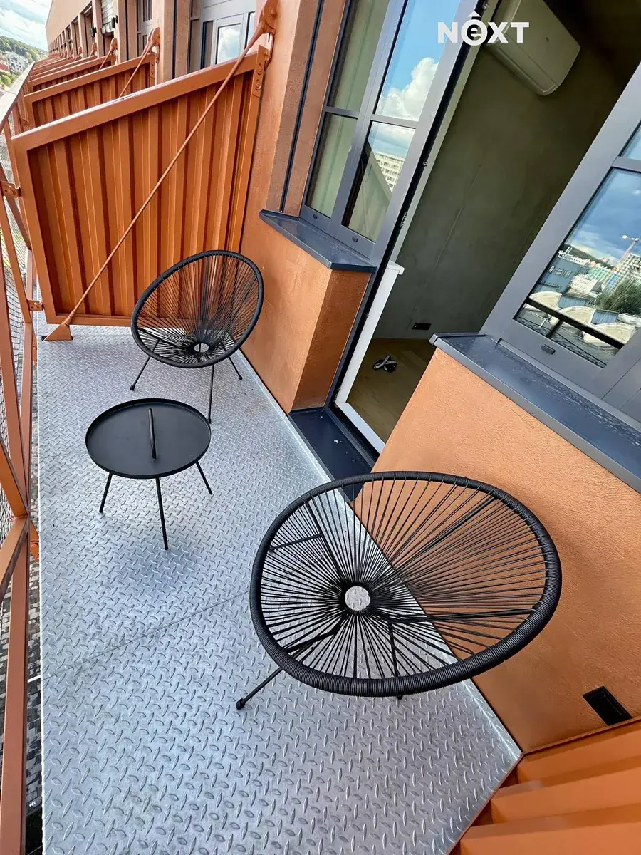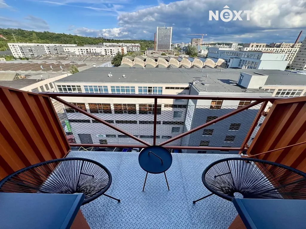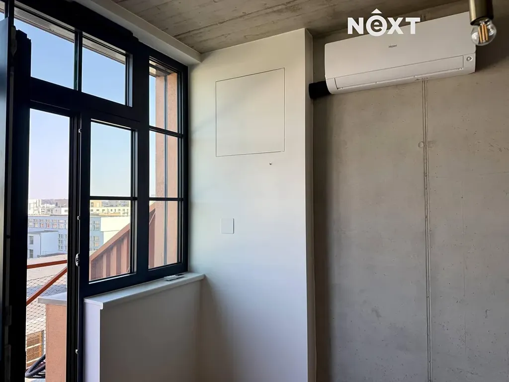 Světlý interiér s velkoformátovými okny a industriálními prvky vytváří osobitou atmosféru. Praktická dispozice 1+kk je doplněna balkonem vhodným pro posezení.