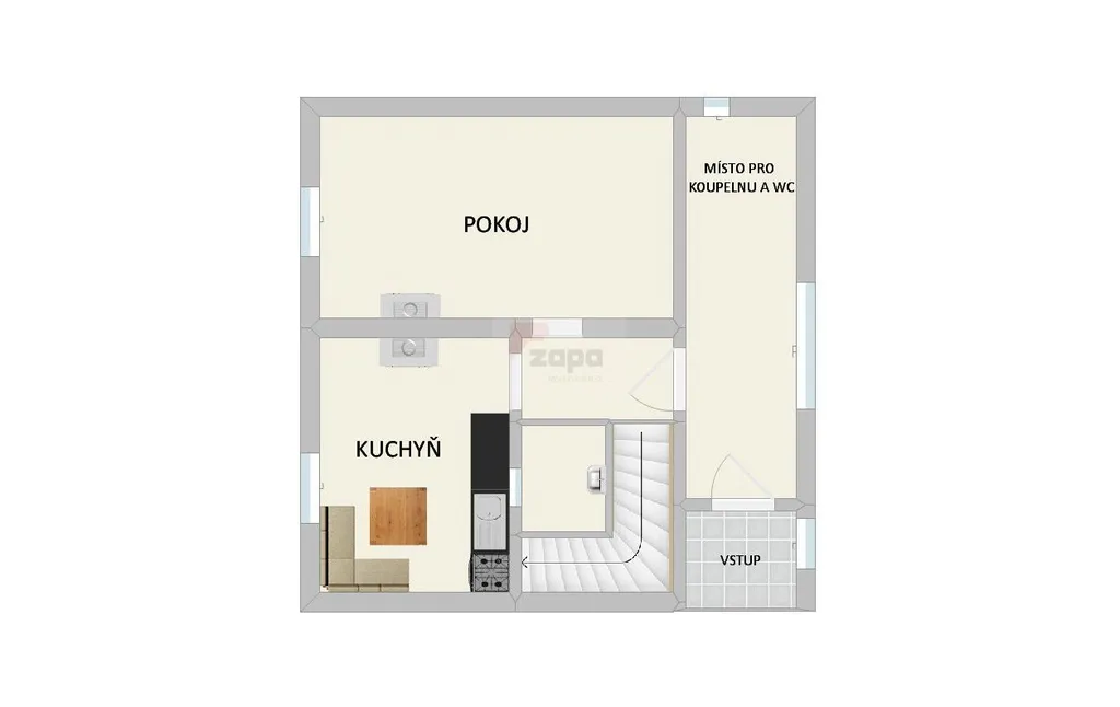 V prvním podlaží je k dispozici kuchyň, pokoj, technická místnost a místnost pro vybudování koupelny s WC. Topení je řešeno kamny na tuhá paliva.