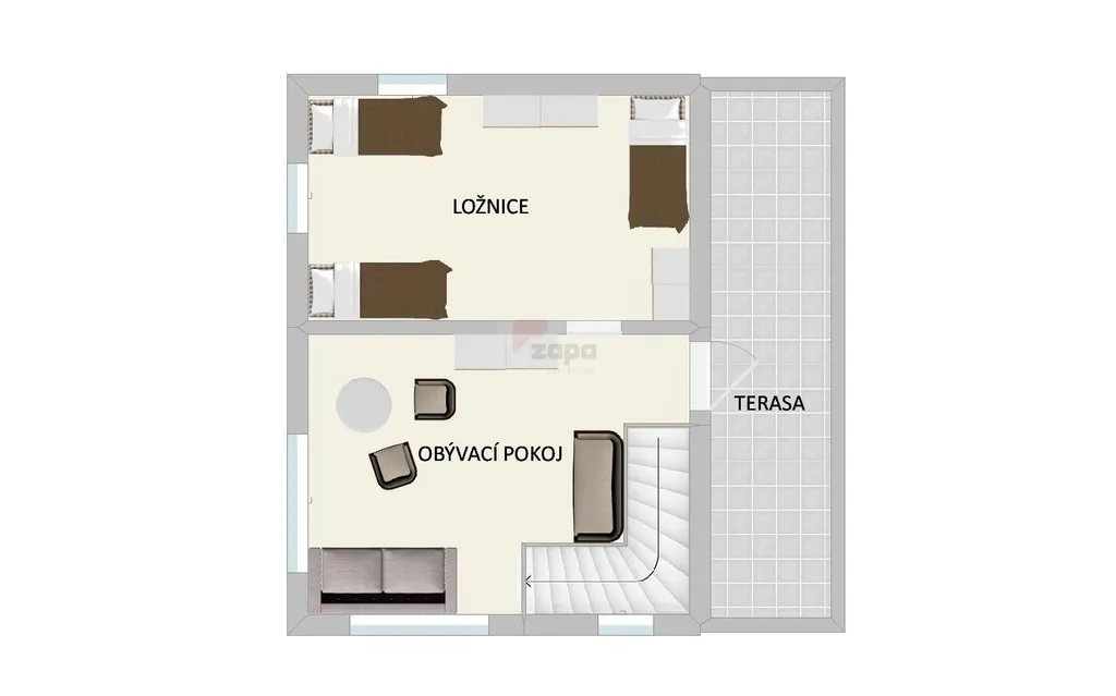 Ve druhém podlaží jsou dva pokoje a terasa s výhledem do přírody.