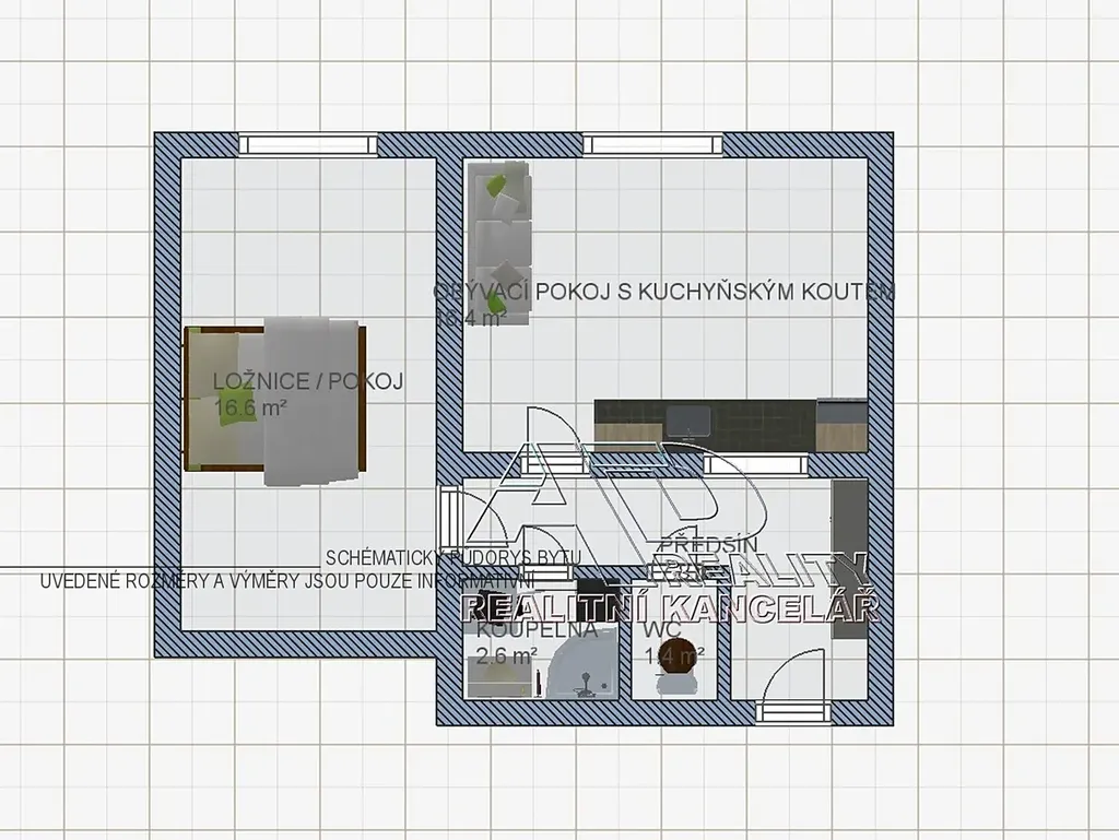 Dispozice bytu: obytná místnost s kuchyňským koutem [16,5m2], předsíň [7,7m2], pokoj / ložnice [16,5m2], koupelna [2,5m2] a WC [1,1m2].