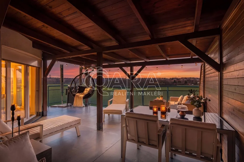 Terasa o velikosti 49 m² obepíná celý obývací prostor, takže byt přirozeně pokračuje ven. Ráno východ, přes den jih, večer západ. Světlo se tu během dne mění a s ním i atmosféra. Dispozice 2+kk (70 m²) působí velmi vzdušně a otevřeně. Obývací část má jemně zaoblený roh, který prostor příjemně změkčuje.