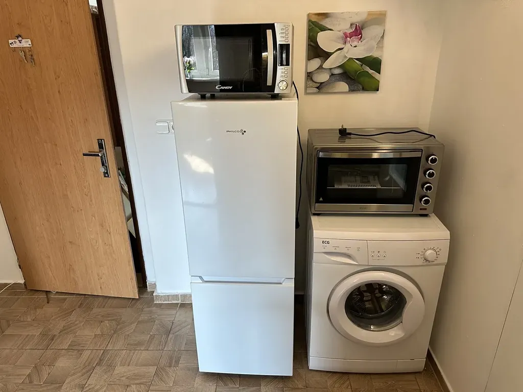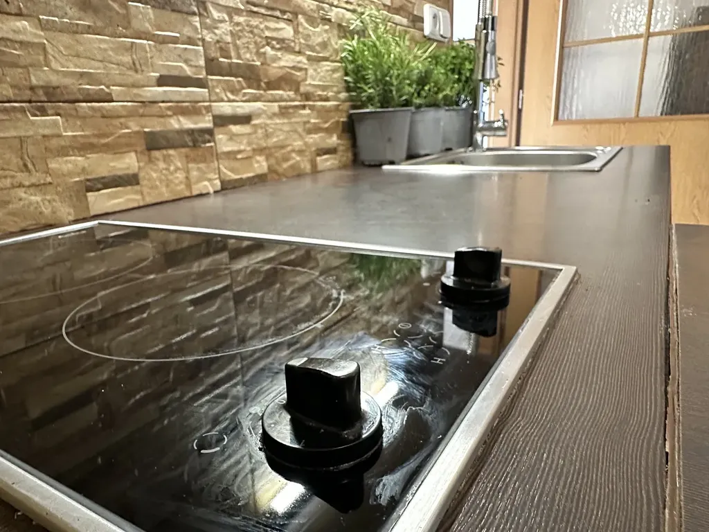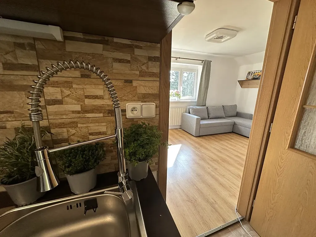 Byt se skládá z jedné obytné místnosti ( ložnice a obývací pokoj) a menší pokoj s kuchyňskou linkou, která je vybavena sklokeramickou varnou deskou, troubou, mikrovlnnou troubou a lednicí. Koupelna je spojena s toaletou, k dispozici je vana i pračka. Vytápění je řešeno elektrickým olejovým topením a v hlavní místnosti jsou navíc krbová kamna, která vytvářejí příjemnou atmosféru zejména v zimních měsících.