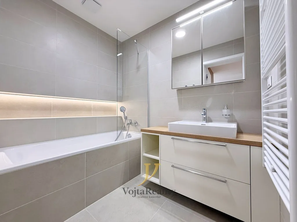 O klima v bytě se stará kombinace teplovodního podlahového vytápění a moderního systému chlazených stropů, doplněná o rekuperaci pro neustálý přísun čerstvého vzduchu. Vytápění i rekuperace lze ovládat přes webový portál.