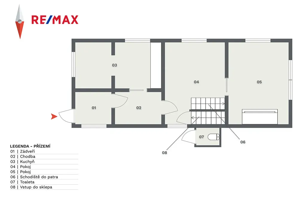 - přízemí: dva pokoje, kuchyně, chodba, schodiště do patra, vstup do sklepa, uzavřená veranda.