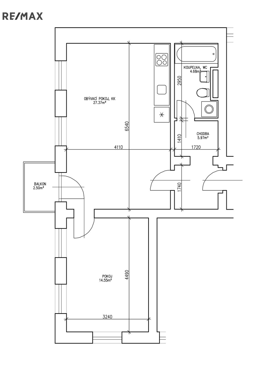 Dispozice bytu se skládá z předsíně (6 m2), v níž je prostor pro vestavěnou skříň, pokoje s kuchyňským koutem a výstupem na balkón (27,4 m2), samostatného neprůchozího pokoje (14,6 m2) a koupelny se sprchovým koutem (4,7 m2). Součástí nemovitosti je také prostorná komora (6,5 m2).