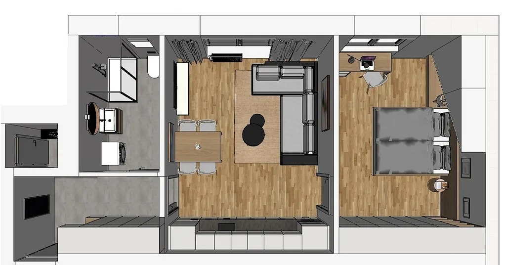 dispozice bytu: pokoj + KK 18,3 m², ložnice 16,3 m², koupelna + WC 5,9 m², předsíň 6,3 m²