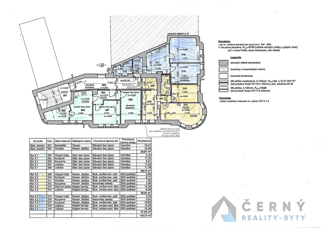 Všechny byty mají vlastní vstup a disponují vstupní předsíní, dvěma pokoji, prostornou kuchyní a koupelnou, společnou s toaletou. Výměry bytů jsou 44,12m2, 41,24m2 a 39,01m2. Součástí celku je společná chodba před byty o výměře 24,87m2.