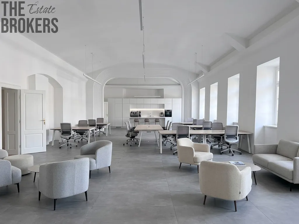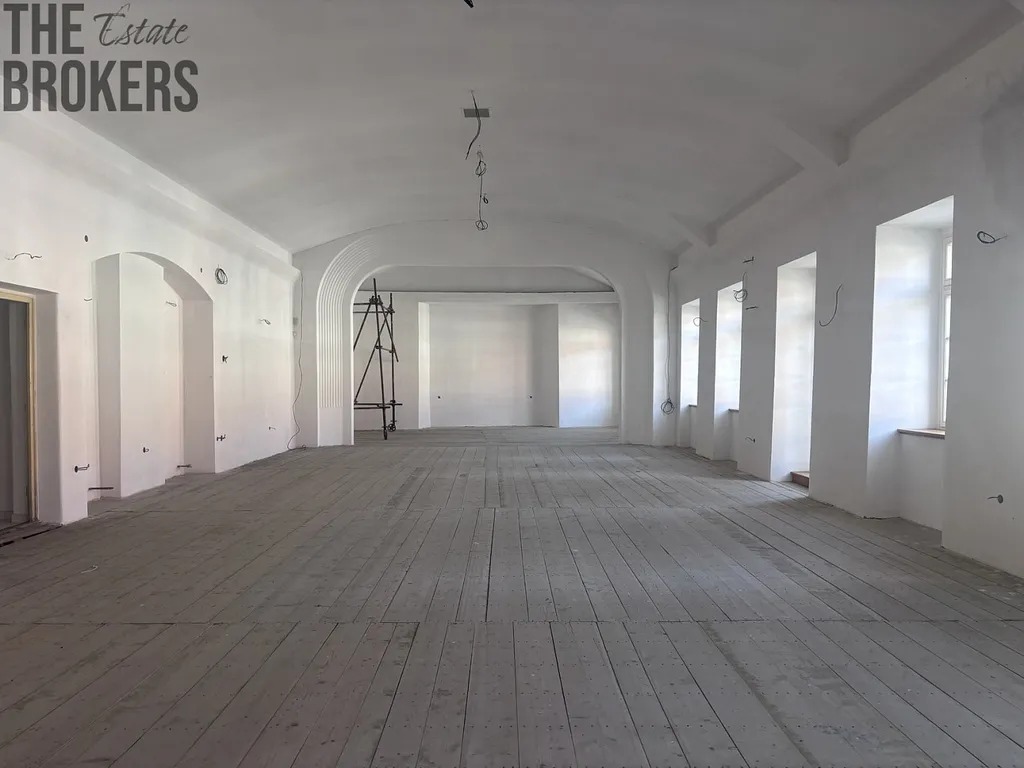 Nabízíme k pronájmu jedinečné reprezentativní prostory v historickém domě Dům u Bílého lva, který se nachází přímo na Náměstí Míru v Blatné. Prostory jsou umístěny v 1. patře cihlového domu a nabízí celkovou plochu přibližně 370 m². Dominantou je velkorysý historický sál o velikosti 219,5 m² s vysokými klenbami a velkými okny, které prostoru dodávají světlo, charakter a jedinečnou atmosféru. Prostory se aktuálně nachází před dokončením rekonstrukce a majitel je připraven finální podobu interiéru upravit dle požadavků budoucího nájemce, včetně dřevěných podlah a dokončení sociálního zázemí, jak ukazují přiložené vizualizace. Součástí dispozice jsou také další místnosti, které mohou sloužit jako kanceláře, jednací prostory, zázemí firmy nebo například jako byt 1+1 či 2+kk. V chodbě je navíc možné vybudovat kuchyňský kout a další koupelnu. U hlavního sálu se nachází dvě samostatné toalety s připravenými rozvody pro sprchy a další místnost vhodná jako kancelář nebo sklad. Velkou výhodou objektu je vjezd do uzavřeného dvora, kde je možné parkování, a k dispozici jsou zde také další úložné prostory. Díky poloze přímo na hlavním náměstí nabízí nemovitost výbornou dostupnost, viditelnost a reprezentativní adresu. Prostory jsou ideální například pro sídlo firmy, coworking, architektonické či designové studio, showroom, vzdělávací centrum nebo kombinaci podnikání a bydlení.