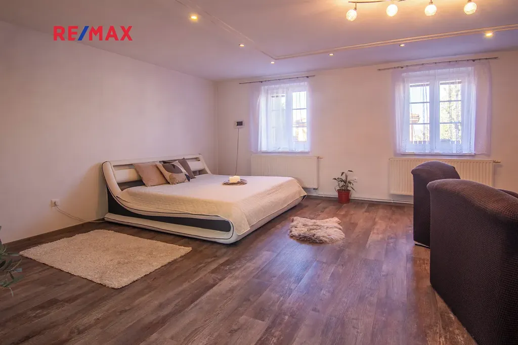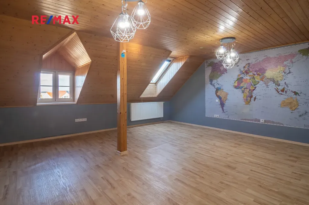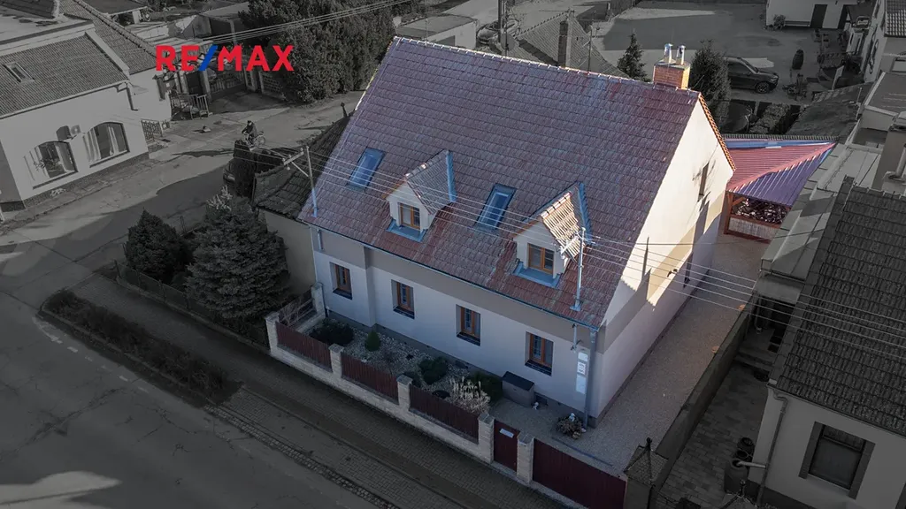 Dům má dispozici 4+1 a nachází se na pozemku o celkové výměře 247 m2. V přízemí najdete prostorný obývací pokoj s výměrou více než 35 m2, dále ložnici, kuchyni s jídelnou a koupelnu s vanou, sprchovým koutem a toaletou. Další samostatná toaleta je se vstupem z chodby. V obytném podkroví se pak nachází prostorná hala, ze kterou vedou vstupy do jednotlivých místností - 2 dětských pokojů (každý s výměrou cca 24 m2), pracovny, šatny a koupelny, která opět nabízí vanu, sprchový kout a toaletu.