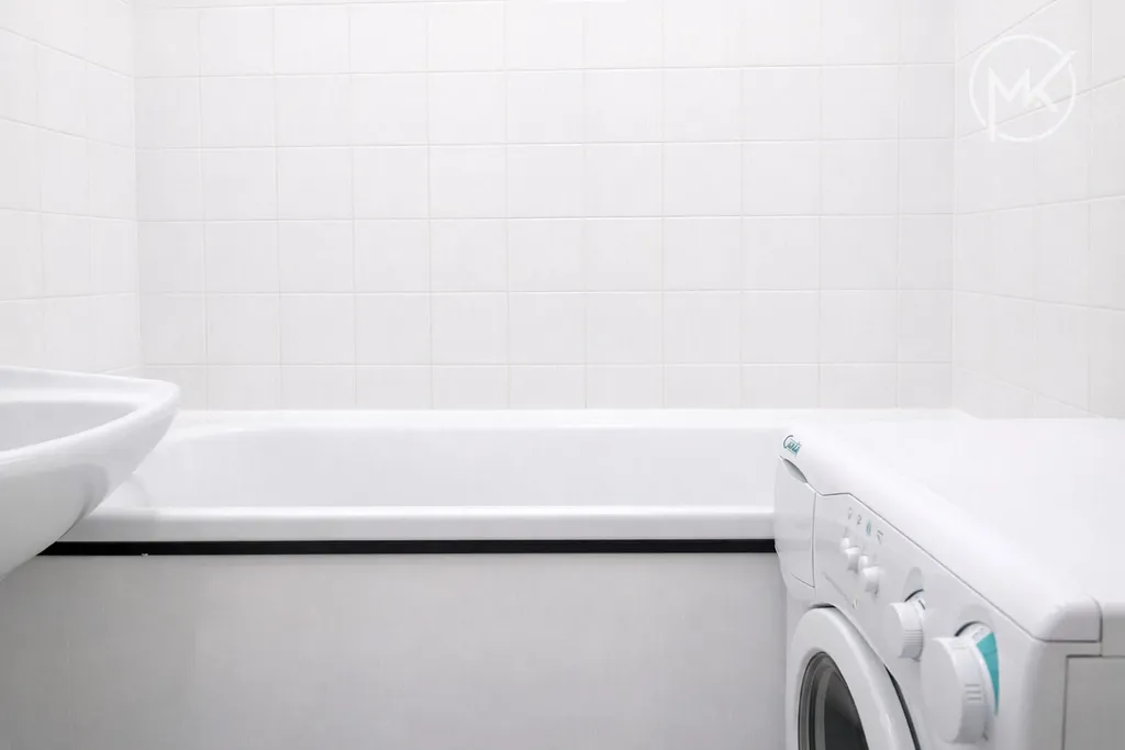 Koupelna a WC udržují jednoduchý, čistý styl — připraveno k okamžitému užívání.
