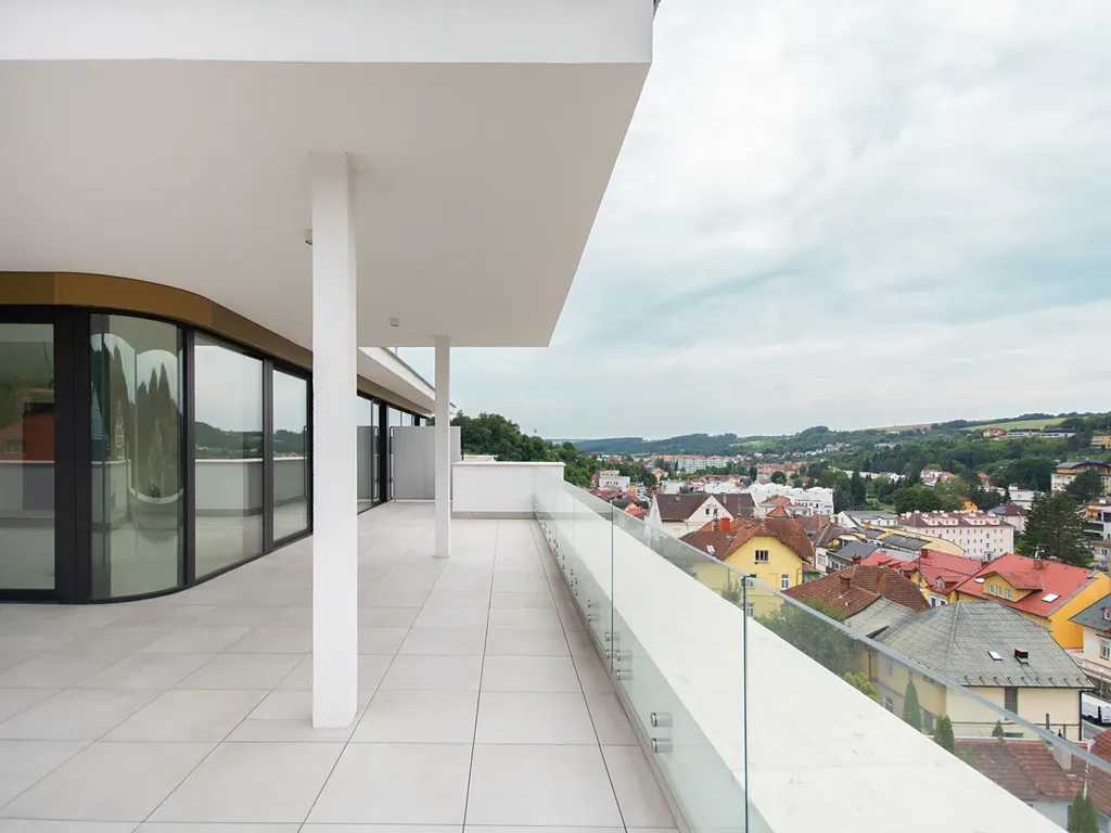 Tento byt přináší ještě další bonusy. Díky tomu, že se jedná o střešní apartmá, nemáte nad hlavou už žádné další sousedy – na patře jsou pouze dva byty. Ze své terasy i francouzských oken si můžete dosytosti vychutnávat dechberoucí výhled na město a přírodu.