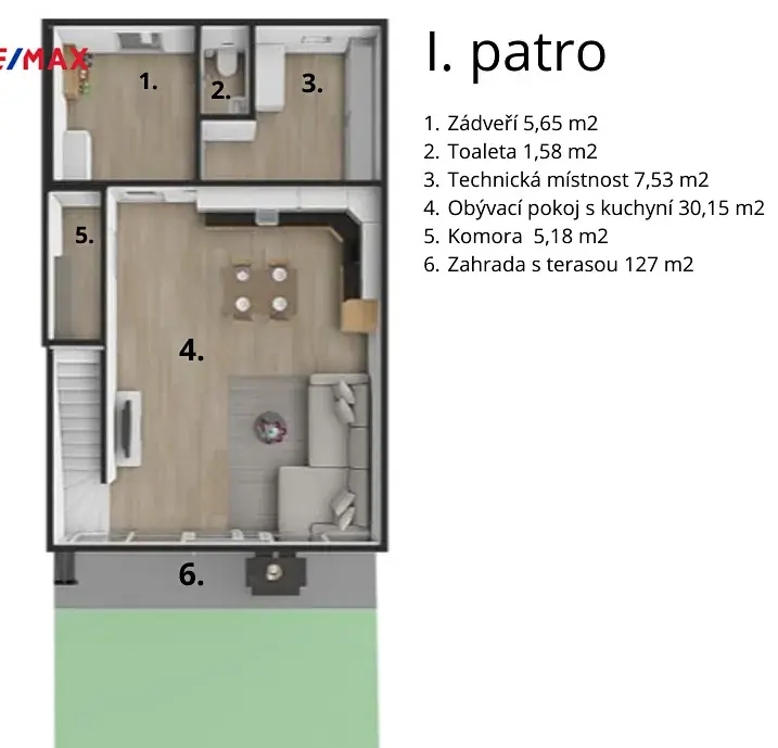 - prostorné zádveří (5,65 m²) – ideální pro velkou vestavěnou skříň