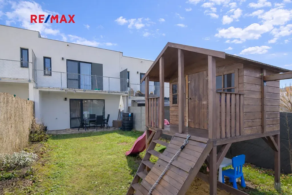 Velkou výhodou domu je orientace zahrady (127 m²) přímo do biokoridoru – zelené zóny s vegetací a herními prvky pro děti. Ze zahrady je přímý vstup do této přírodní oblasti, která nabízí maximální soukromí, klid a kontakt s přírodou. Ideální pro rodiny s dětmi, milovníky klidu i majitele psů.