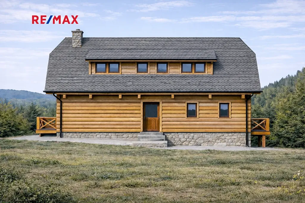 Součástí prodeje je projekt rodinného domu – roubenky s dispozicí 5+KK, která spojuje tradiční vzhled dřeva s moderním bydlením.