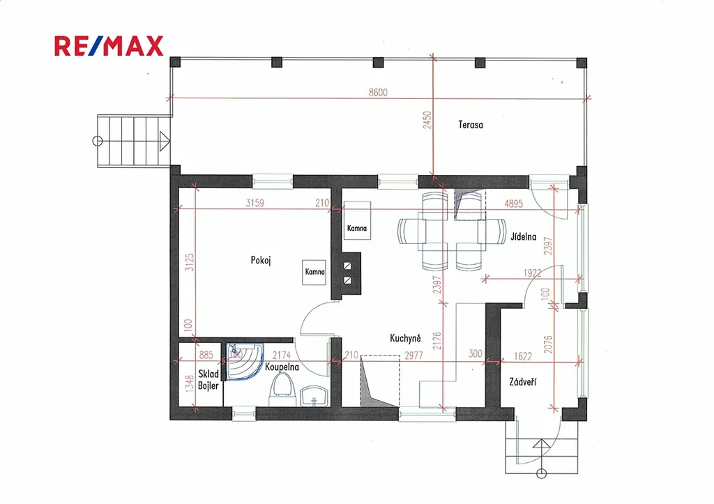 Dispozice přízemí: prostorná vstupní chodba, kuchyňský kout s jídelním posezením, obývací místnost, velká zastřešená terasa, z kuchyně je i vstup do sklepa.