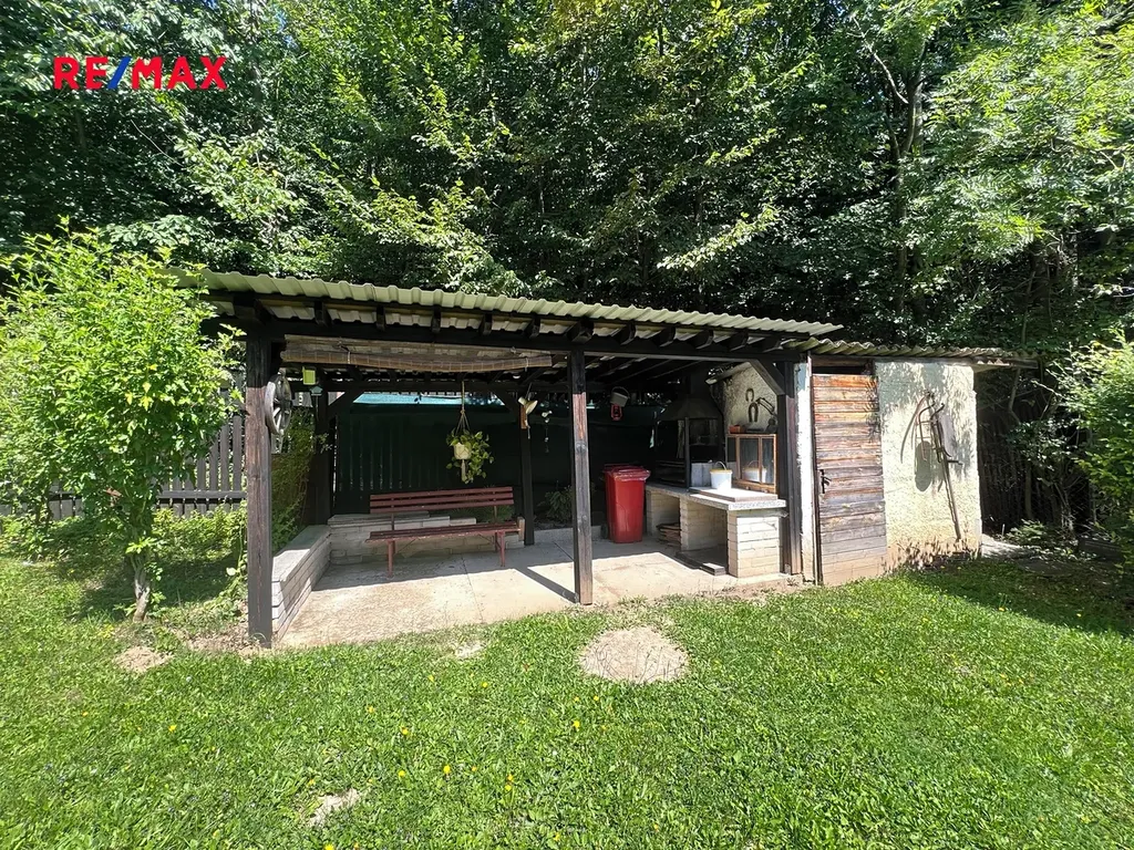 Na pozemku stojí dřevěná pergola na posezení a grilování, na ni navazuje zděná kůlna a suché WC, plechová bouda na uložení zahradního nářadí.