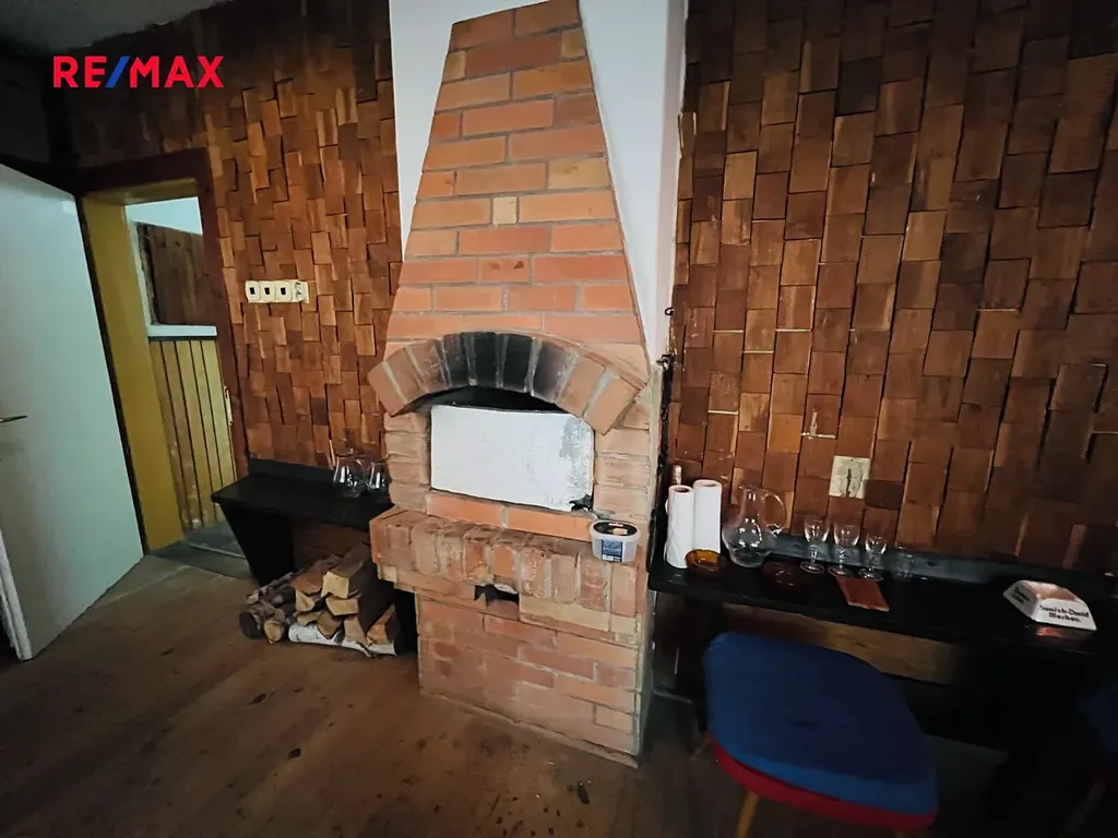 Vnitřním schodištěm se vystoupá do patra, kde se nachází posezení u krbu a malá kuchyňka.