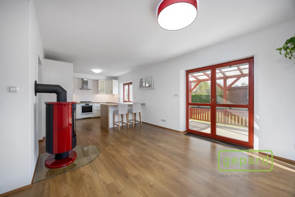 Samozřejmostí je podlahové vytápění v celém domě, které zajišťuje rovnoměrné a příjemné teplo bez nutnosti řešit radiátory. V chladnějších měsících oceníte také krbová kamna, která dodávají interiéru nejen další zdroj tepla, ale především jedinečnou atmosféru domova.