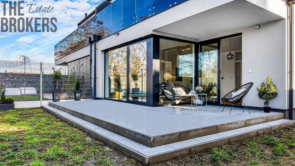 Dům je vybaven podlahovým vytápěním, fotovoltaickými panely a prostornou garáží, což zajišťuje komfortní a energeticky úsporný provoz.