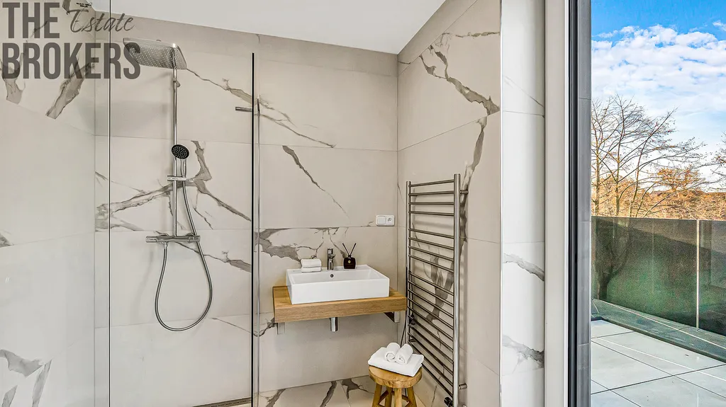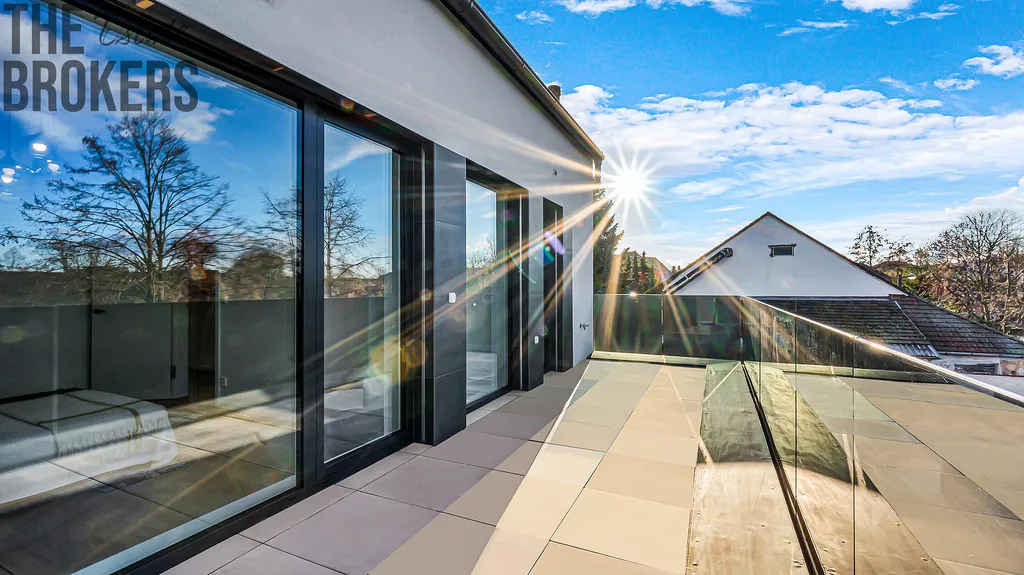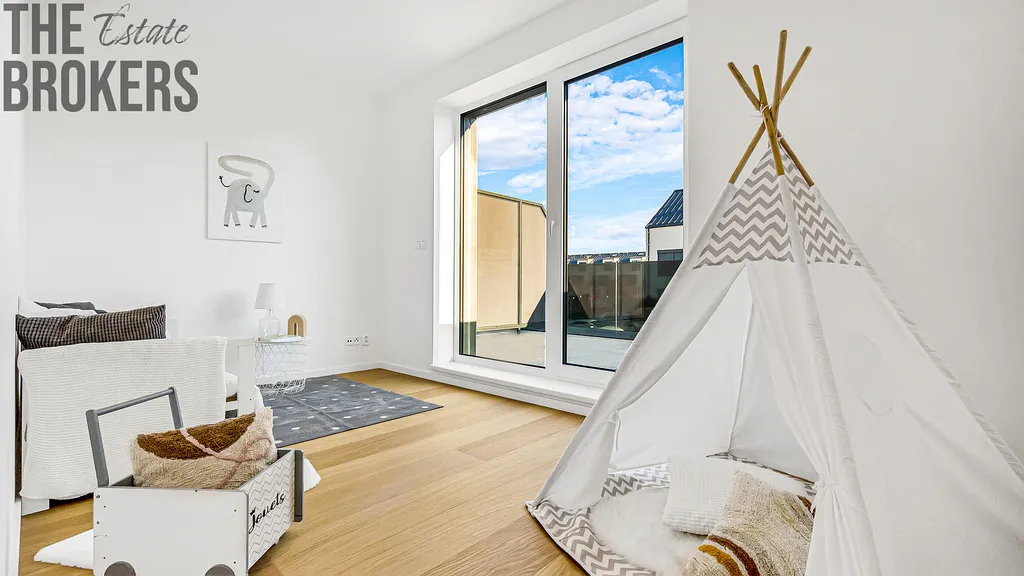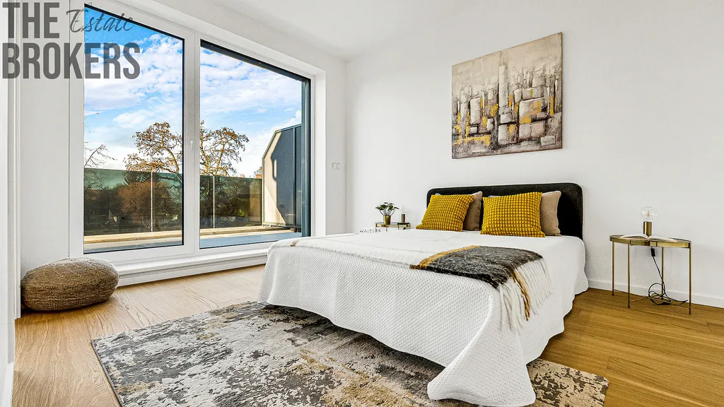 V prvním patře se nachází hlavní ložnice s vlastní koupelnou, šatnou a soukromou terasou. Dále jsou zde dva dětské pokoje, každý s vlastní terasou, a další koupelna. Dispozice je ideální pro rodinné bydlení s dostatkem soukromí pro každého člena domácnosti.