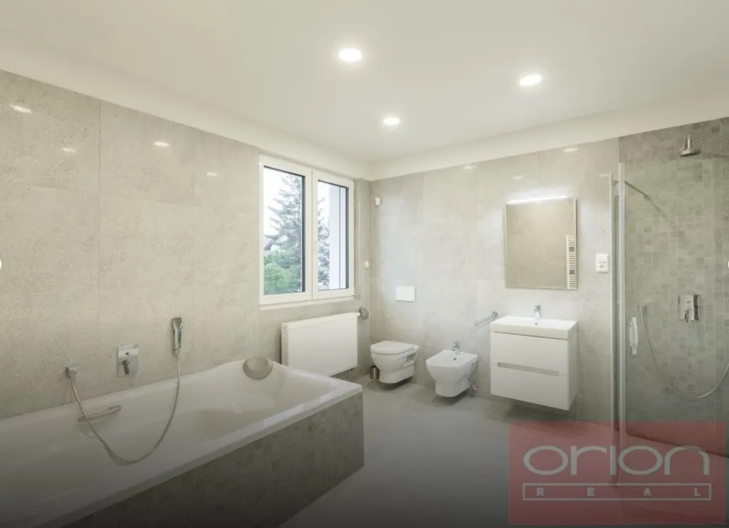 Nabízíme k pronájmu moderní rodinný dům 6+kk s udržovanou zahradou v klidné lokalitě v zástavbě rodinných domů poblíž Milíčovského lesa v Újezdu u Průhonic. Dům má celkovou plochu 260m2 a nabízí v přízemí vstupní halu, plně vybavenou kuchyň se všemi spotřebiči, obývací pokoj s krbem a se vstupem na terasu, koupelnu s vanou a sprchovým koutem, samostatnou toaletu, prádelnu a pokoj pro hosty. V podkroví se nachází 4 ložnice, dvě koupelny s vanou a sprchovým koutem a terasa. K dispozici je garáž pro 2 auta. K vybavení domu patří dřevěné parkety a dlažba, alarm. Na zahradě o velikosti 900 m2 je automatický zavlažovací systém. Dobrá dostupnost do centra a do mezinárodních škol. Zastávka autobusu je 150 m od domu, autem blízký nájezd na dálnici D1.
