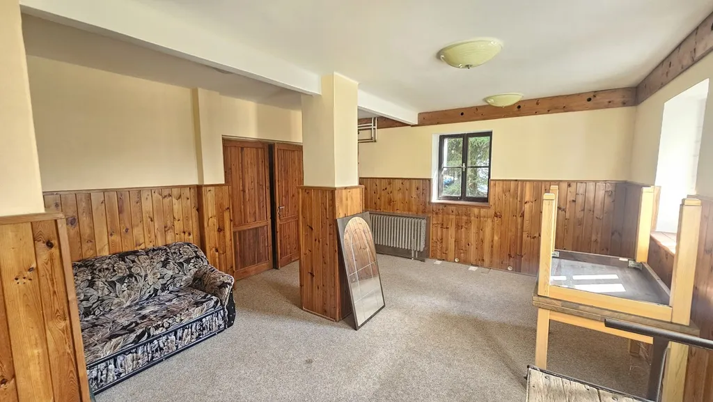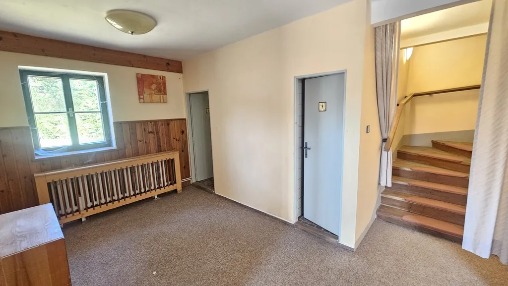 Samotná budova s užitnou plochou 412 m² dříve sloužila jako restaurace s terasou a disponuje bytovou jednotkou 3+1 pro správce, přičemž v podkroví se nacházelo další ubytování pro personál. Objekt tak nabízí velkorysé prostory a široké možnosti budoucího využití, ať už pro vznik apartmánového domu, menšího penzionu či kombinace vlastního bydlení s podnikáním.