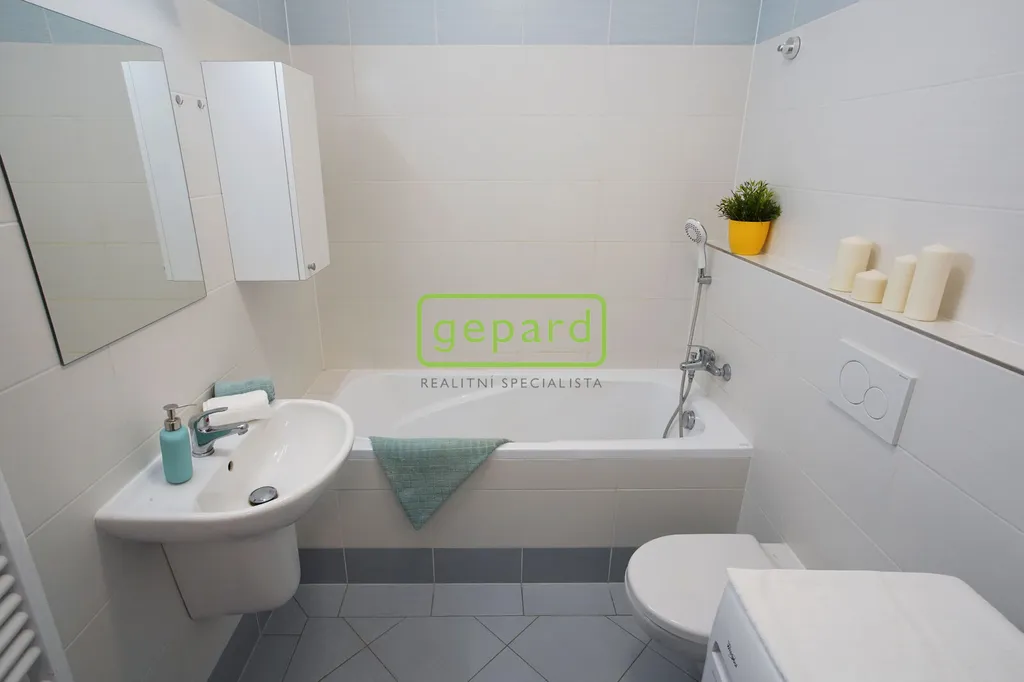Koupelna je s vanou, WC je závěsné, je zde i přípojka na pračku a sušičku.