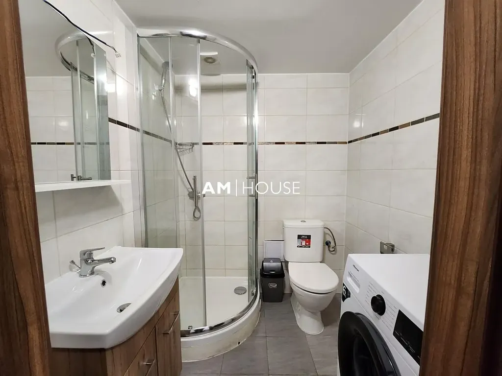 Při vstupu do bytu máme zařízený kuchyňský kout. Koupelna má sprchový kout, WC, pračku a umyvadlo.