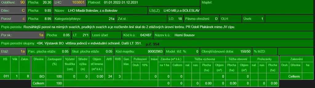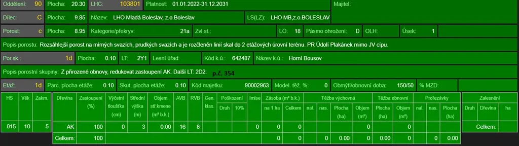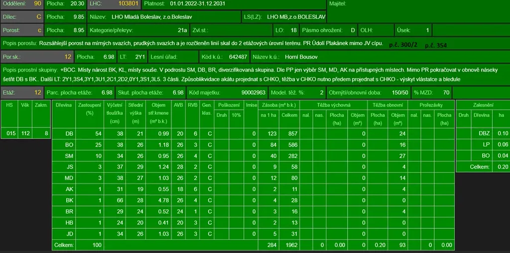 - p.č. 354 vedená jako lesní pozemek o celkové výměře 27 543 m2 (stáří lesa 116 let - zastoupení dřevin dub, borovice, smrk, jasan, modřín, akát, buk, bříza, habr, jedle, stáří lesa 14 let - zastoupení dřevin akát, stáří lesa 5 let - zastoupení dřevin borovice).