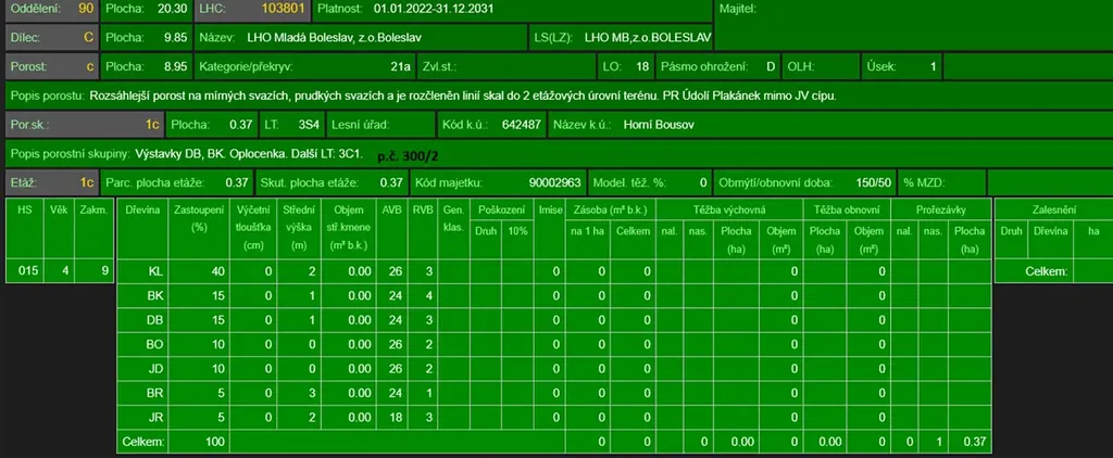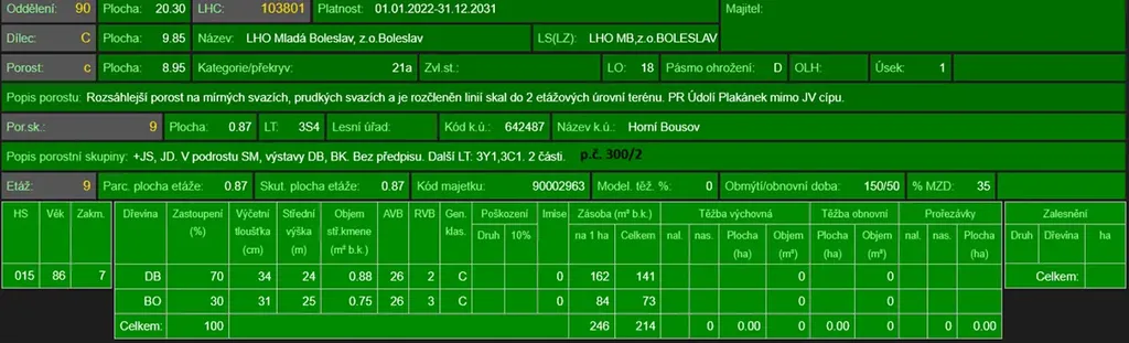 - p.č. 300/2 vedená jako lesní pozemek o celkové výměře 32 091 m2 (stáří lesa 116 let - zastoupení dřevin dub, borovice, smrk, jasan, modřín, akát, buk, bříza, habr, jedle, stáří lesa 90 let - zastoupení dřevin dub, borovice, stáří lesa 8 let - zastoupení dřevin javor, buk, dub, borovice, jedle, bříza, jeřáb ptačí),