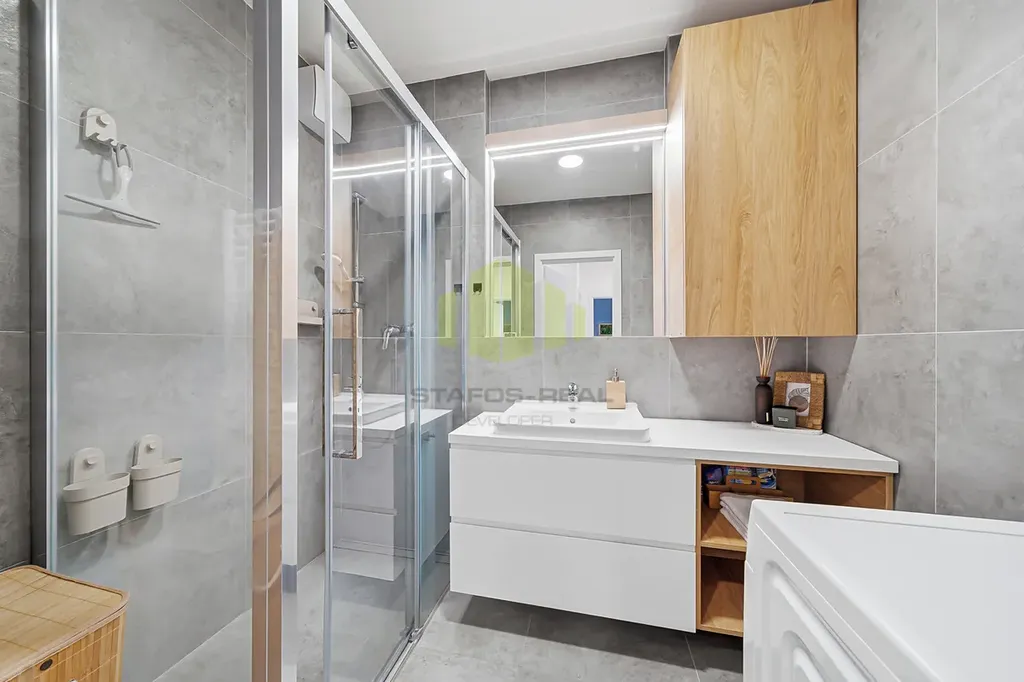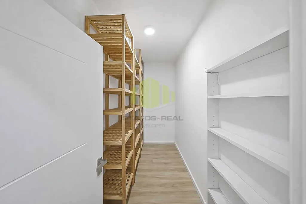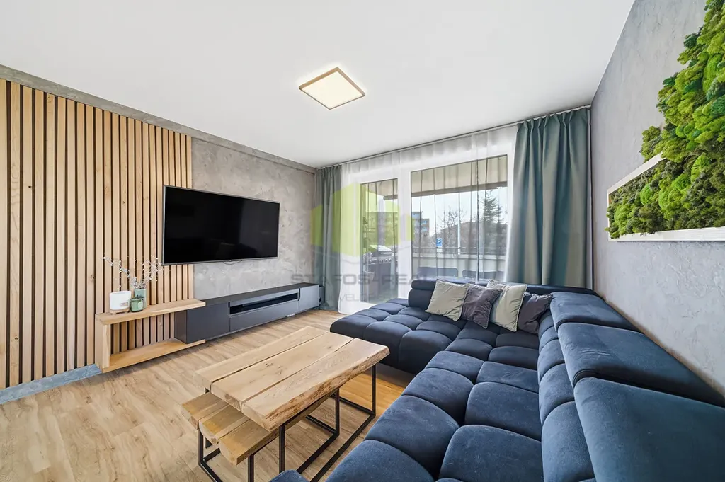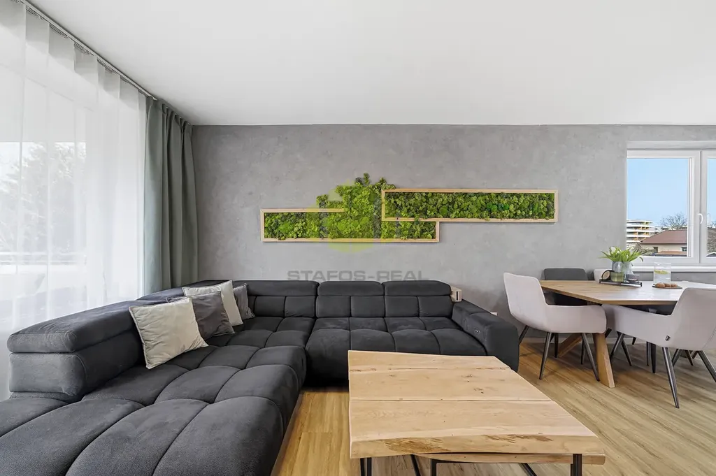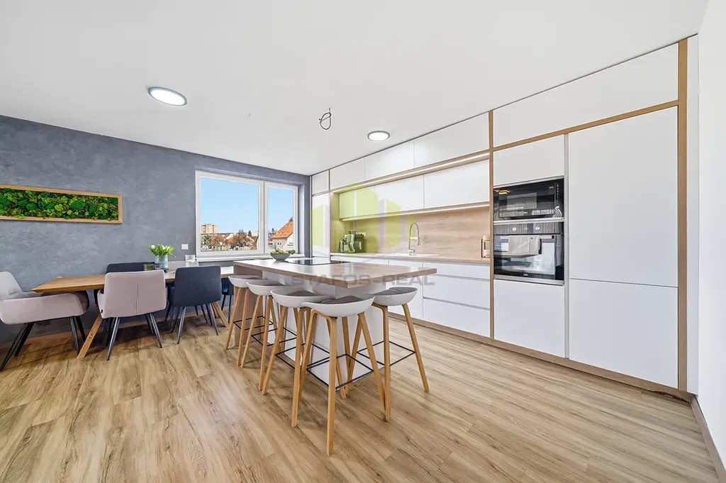 Dominantou bytu je velkorysý obytný prostor s moderní kuchyňskou linkou vyrobenou na míru v nadčasovém bezúchytkovém designu, doplněnou o kuchyňský ostrůvek s varnou deskou a barovým sezením. Kuchyně je plně vybavena vestavěnými spotřebiči, designovou digestoří a kvalitní pracovní plochou. Na kuchyň přirozeně navazuje jídelní část a obývací zóna s dostatkem prostoru pro relaxaci i společenské chvíle. Interiér je vkusně doplněn o designové prvky, jako jsou lamelové obložení stěn a dekorativní povrchy, které podtrhují moderní a nadčasový charakter bytu.