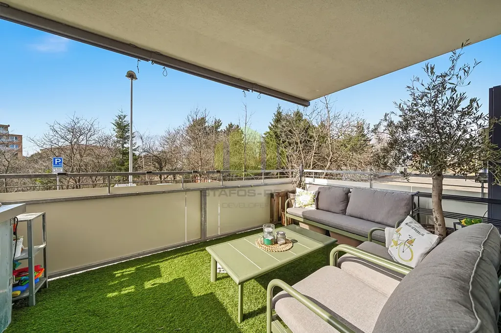 Lodžie o výměře 10,61 m² představuje plnohodnotný venkovní obytný prostor. Je zastřešená, vybavená markýzou a nabízí dostatek místa pro posezení i grilování, které je zde běžně využíváno. Díky orientaci na severozápad si zde užijete příjemné odpolední a večerní slunce.