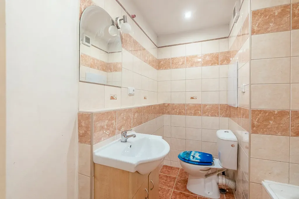 Koupelna je zděná, prostorná, s menší vanou, přípojka na pračku je v předsíni, kde jsou další úložné prostory ve velké skříni.