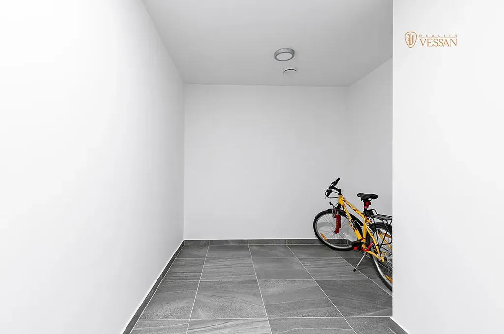 Jednotka disponuje prostorným pokojem, vybaveným nadstandardní značkovou vestavěnou kuchyňskou linkou Hanák včetně kvalitních spotřebičů. Koupelna má sprchový kout, pračku a je spojena s WC. Předsíň zahrnuje instalovanou šatní skříň.